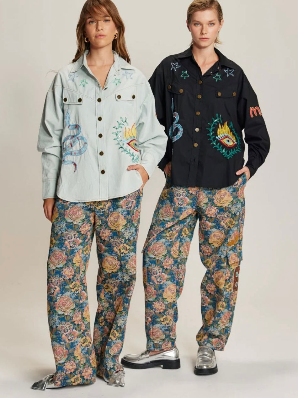 100% Cotton. Button down collar shirt with long sleeves and cuffs. Shirt has a rounded hemline. Shirt is in denim and is embroidered with many cute graphics, such as palm trees, cactus, suns and hearts.