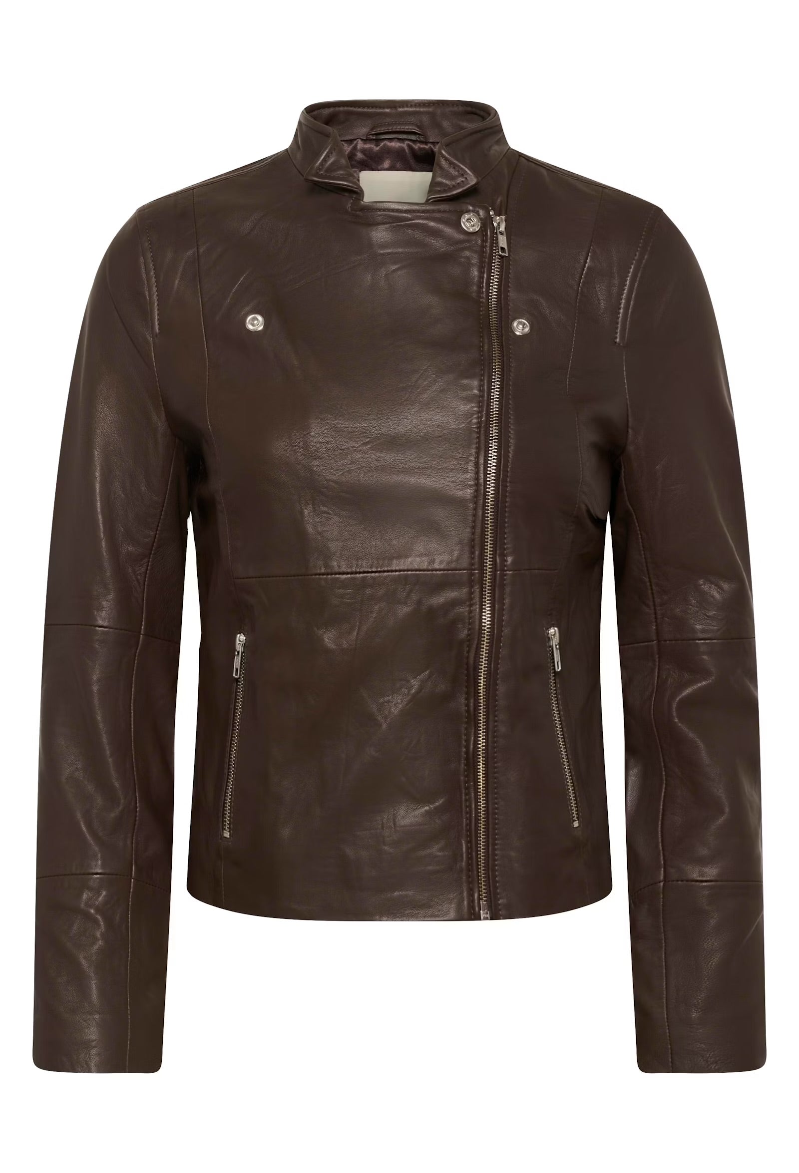 This women’s leather biker jacket offers a modern slim fit with an asymmetrical front zip, classic lapel collar, and zipped pockets. Ideal for layering, its timeless silhouette ensures versatile styling and all-day comfort.