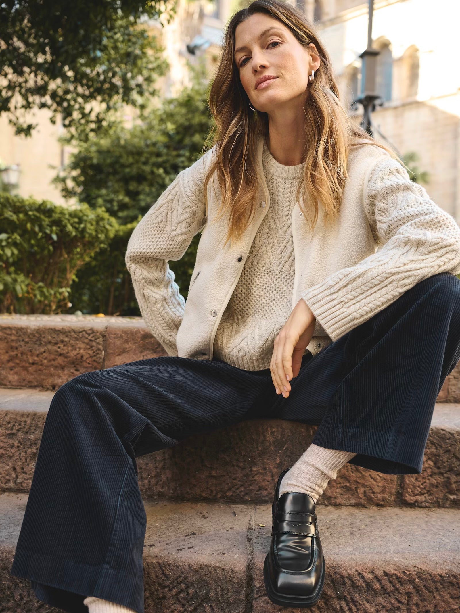 The model is 175 cm tall and wears a size 36. This soft teddy fleece vest features snap buttons and zipped front pockets. With its slightly boxy fit, it's ideal for layering over a tee or under a jacket during transitional seasons.