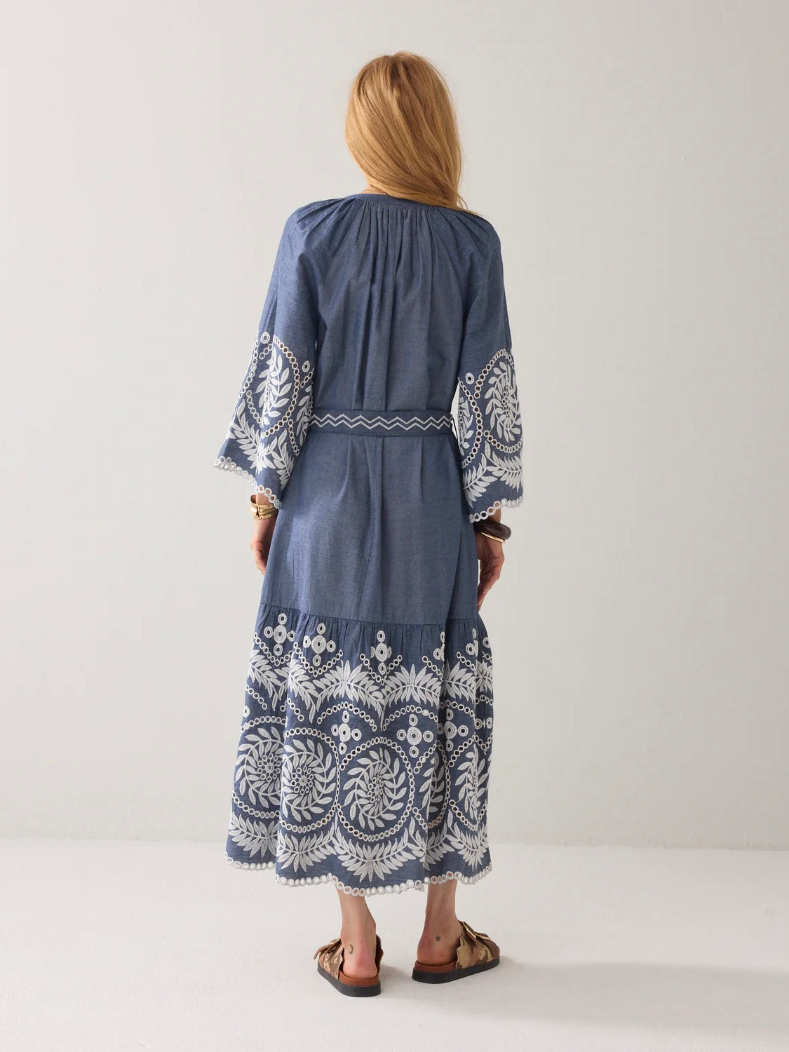 Dress in soft chambray with rich embroidery details. The dress has trumpet sleeves with a scalloped edge, a skirt with ruffles on the bottom and comes with a matching embroidered belt.