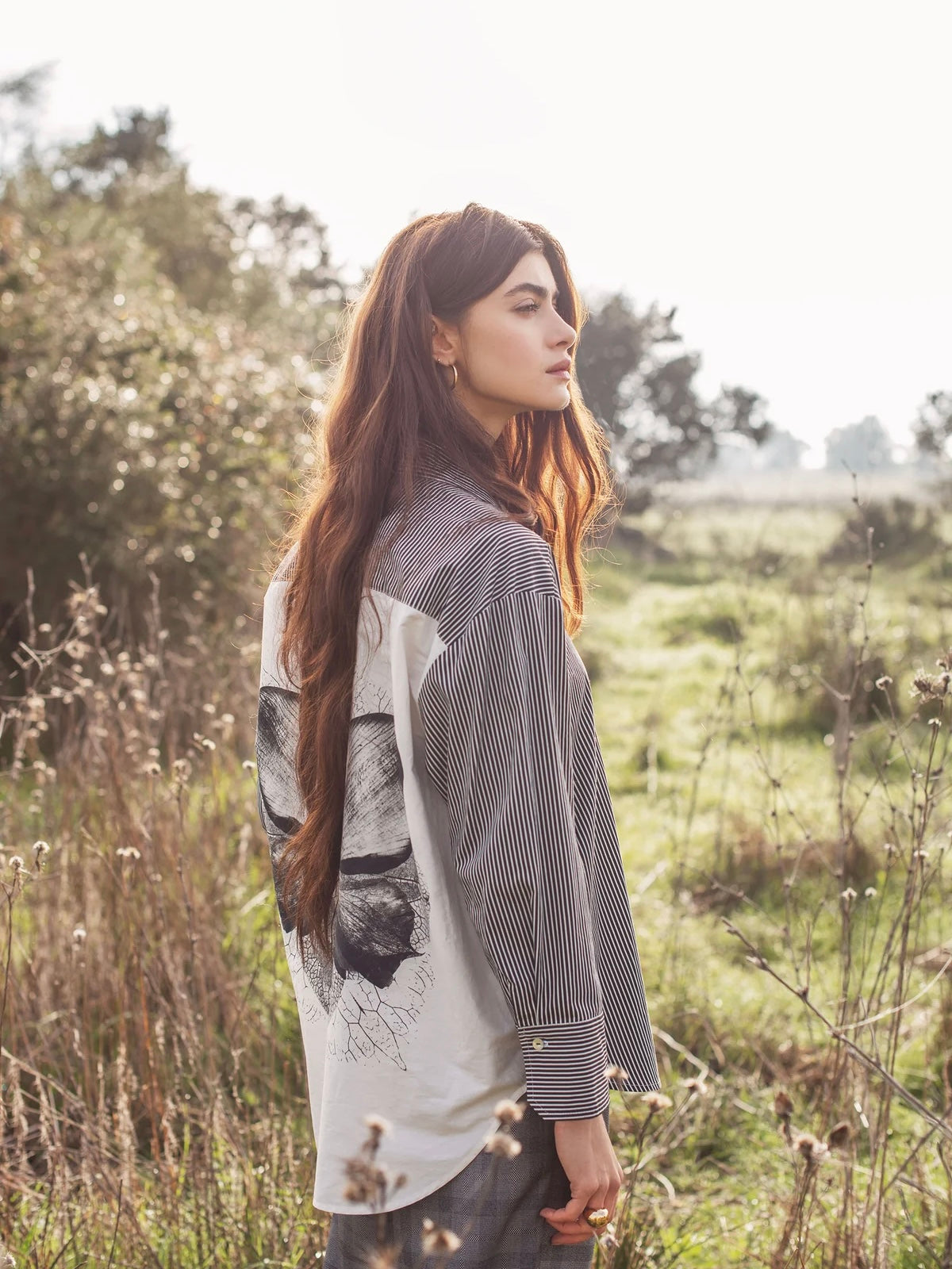 This loose-fitting shirt blouse combines a printed stripe with a unique floral print. The blouse has a lowered shoulder seam and adjustable cuffs.