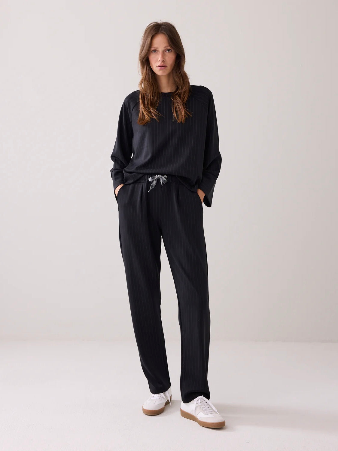 These sporty trousers feature a chic pinstripe and a relaxed fit. The trousers have an elasticated waist with a string and waistband pleats.