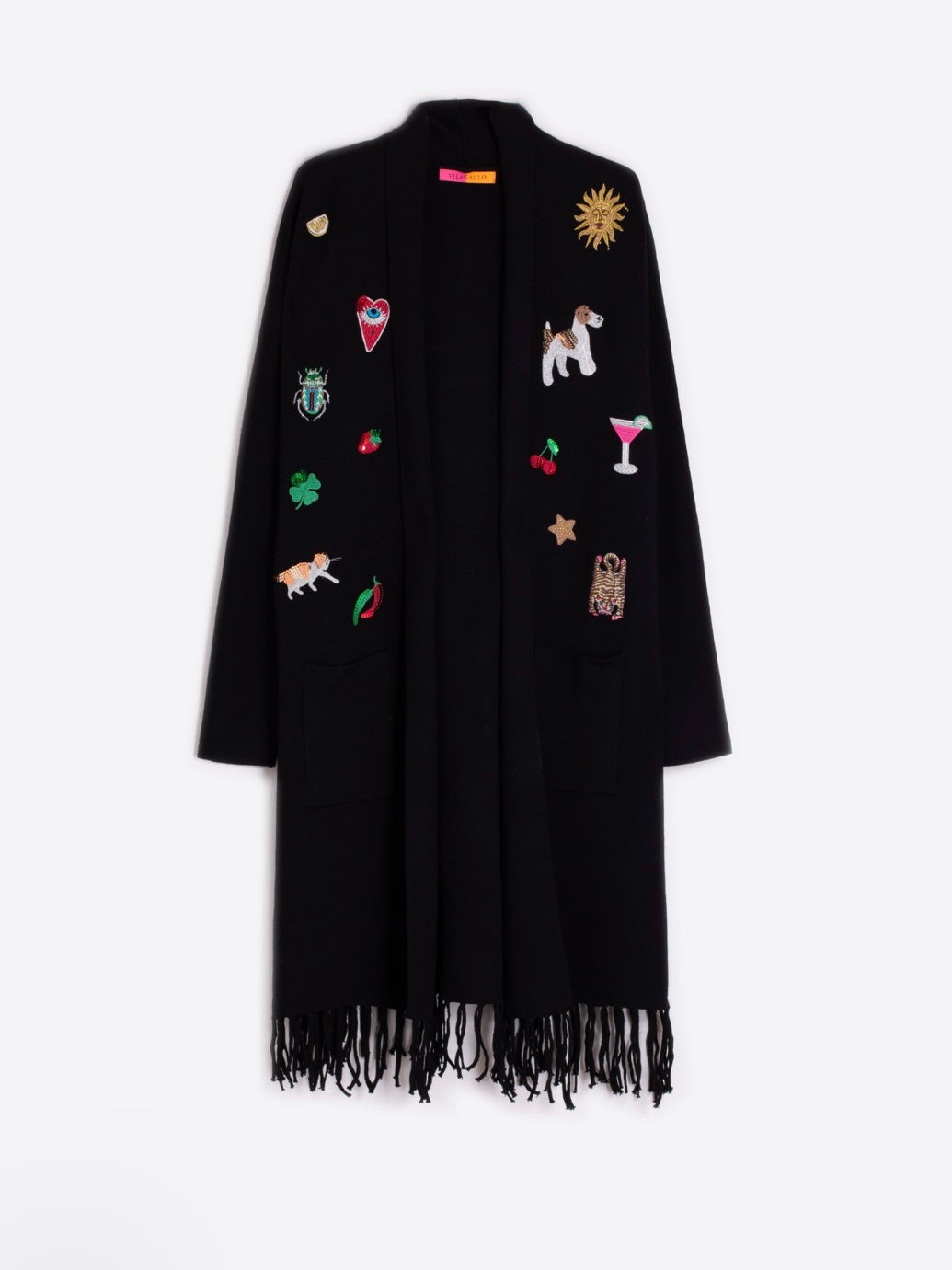 Long black open-front cardigan with decorative multicolor embroidery on the front. Features patch pockets and a hem finished with long fringe. Straight cut and shawl collar. The mid-weight fabric has a soft feel and structured drape.