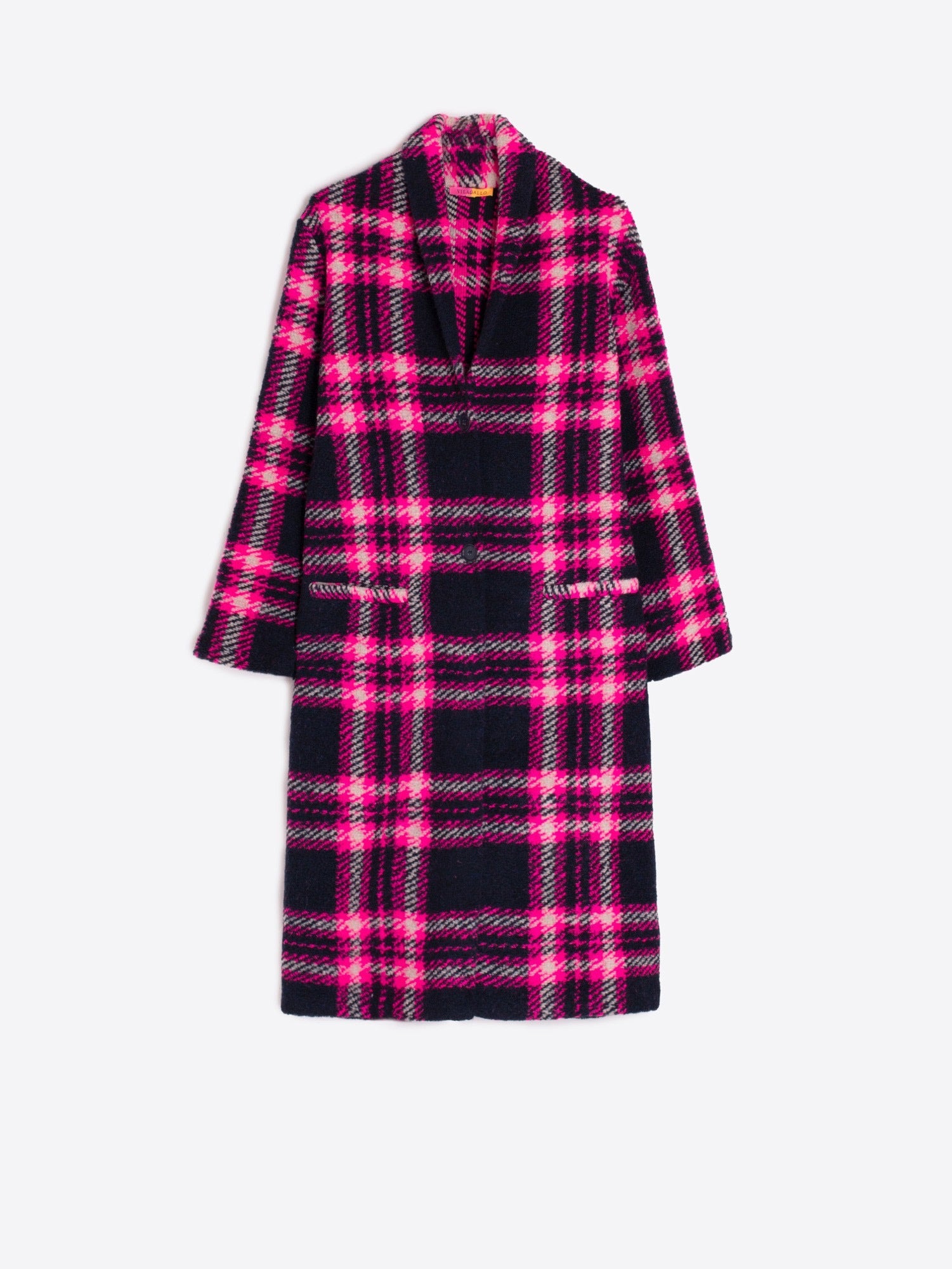 Long structured coat with check pattern in fuchsia pink and navy tones. Classic lapel collar and crossover front closure. Two front welt pockets. Below-the-knee length. Soft, heavy-weight fabric with wool blend,