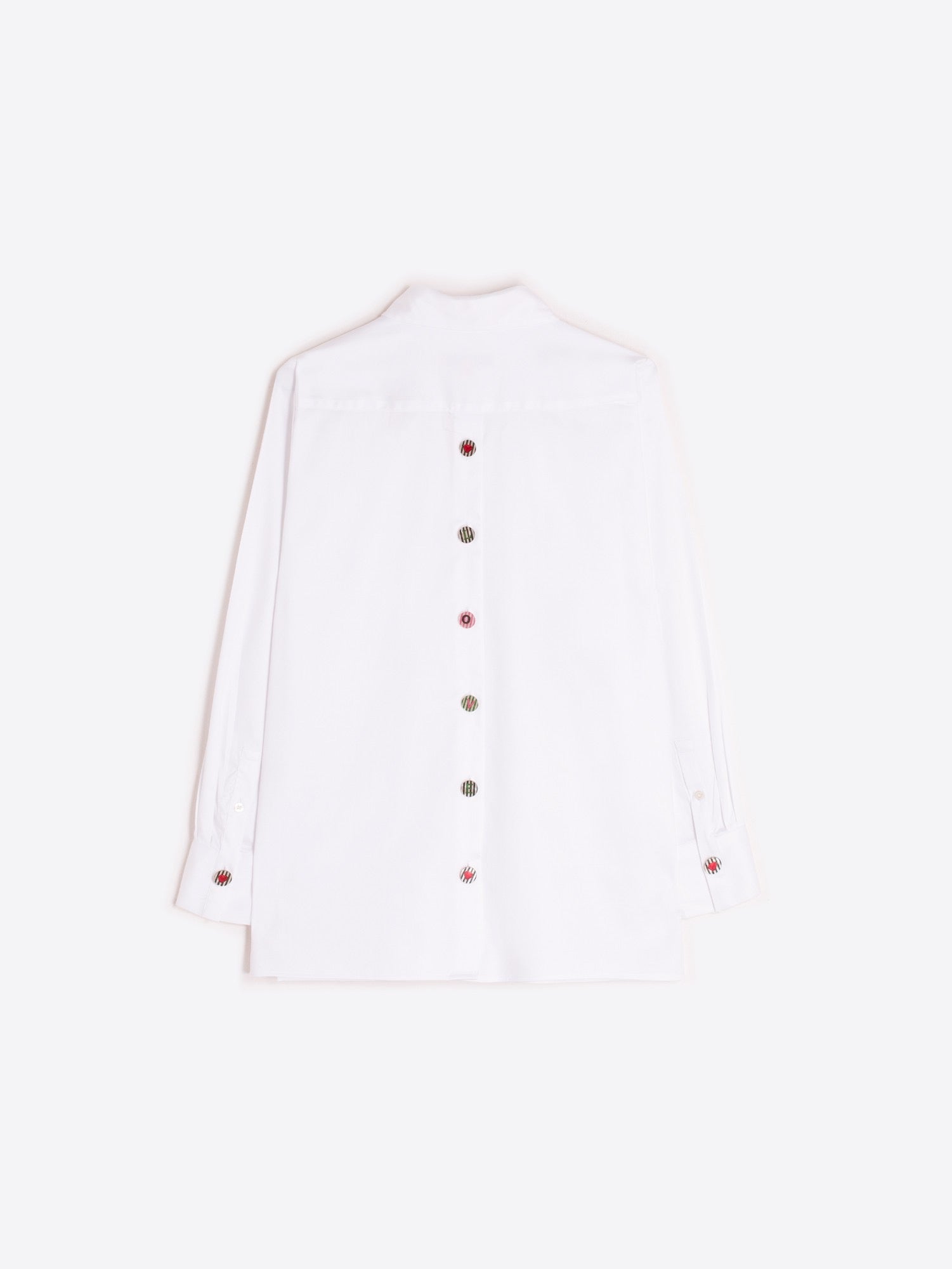 Straight-cut white shirt with a classic collar and front button closure. The back features a vertical row of illustrated buttons that spell the word “LOVE”. Long sleeves with single cuffs. Made of 96% cotton and 4% elastane for structure and ease. Straight hem.